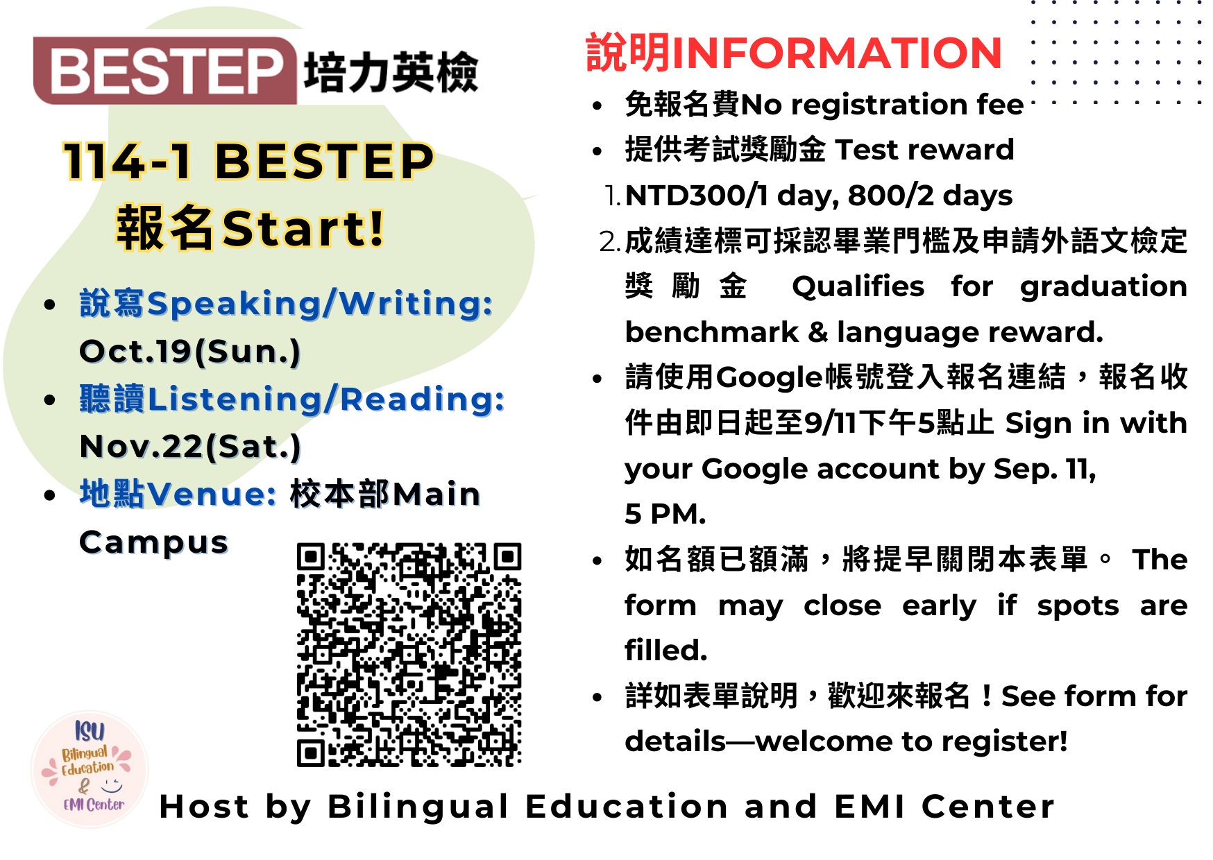 114學年度第1學期「培力英檢」現正開放報名,即日起至 9/11(四)下午5點止,若名額額滿將提前關閉報名系統。